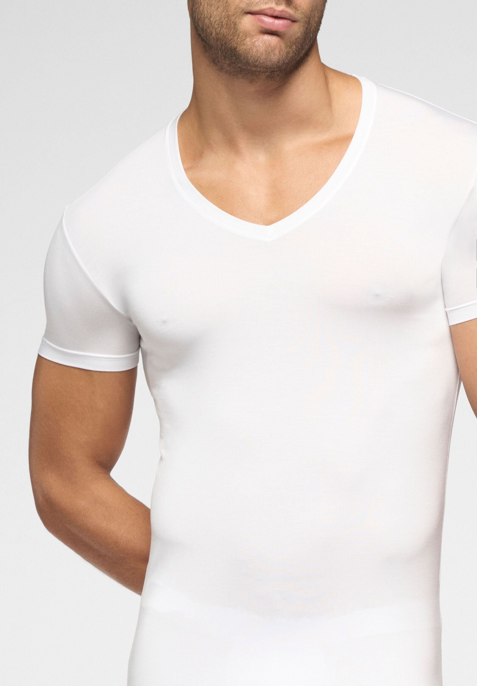 The stretch modal that makes up this T-shirt is exceptionally light, lighter than silk, to offer you a feeling of extraordinary lightness on contact with your skin. It is also incredibly resistant: wash after wash it retains all its characteristics. Finally, the fabric has a high hygroscopic index: this means that it has a high capacity to absorb moisture, leaving your skin perfectly dry. Priceless freshness. The fibre that makes it up is a thin, soft and elastic fibre that is born from beech wood in an environmentally sustainable way. A wrap-around shirt, perfect and invisible under the second button of the shirt.